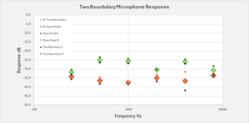 Open field measurement F Hz Vol Track L Track R Av LR % dB dB dB 250 32 -35.6 -32.9 -34.3 500 43 -38.3 -34.6 -36.5 1000 53 -38.4 -36.5 -37.5 2000 78 -36.7 -33.0 -34.9 4000 72 -41.8 -31.5 -36.7 8000 61 -34.3 -32.9 -33.6 Large Two-boundary measurement F Hz Vol Track L Track R Av LR Enhancement? % dB dB dB dB 250* 32 -33.1 -30.3 -31.7 2.6 500 43 -26.3 -23.5 -24.9 11.6 1000 53 -26.8 -24.3 -25.6 11.9 2000 78 -30.3 -30.4 -30.4 4.5 4000 72 -27.0 -24.6 -25.8 10.9 8000 61 -33.1 -28.3 -30.7 2.9 7.4 Av 11.9 Mx dB