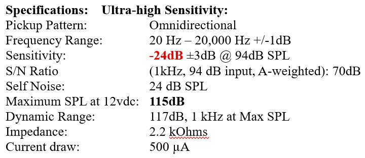 [Ed Note: This is a -24 dB sensitivity microphone, about as sensitive as any microphone on the market today. Powered by PiP with small recorders that do not provide phantom power, like my Evistr! I have placed the microphone between two boundary surfaces at right angles to each other, the mic facing outward and nearly flush with the surfaces. Presumably that should provide upwards of 12 dB boost to the sensitivity, making the setup have an overall -12 dB sensitivity. Sounds fantastic! I am not seeing it in my records. I am not even sure if the mic itself has a -24 dB sensitivity.