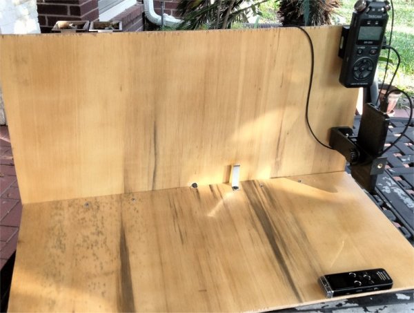 The following image shows the SP-LAV-1 mounted flush in the center of my homegrown two-surface boundary rig. A german criticism of the PZM concept appears to favor the microhone to be forward-facing with an obstacle in front. The function of the obstacle is to prevent an increase in the high frequencies. As my goal is to record low-frequency owl calls, and because fashioning and placing an obstacle is trouble, I have neglected this aspect.